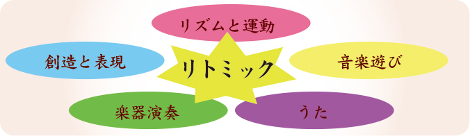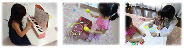 - 当教室ではお子様の年齢、発達、個性に応じてカリキュラムを作っています。「リズムと運動」「音楽遊び」「うた」「楽器演奏」「創造と表現」といった、リトミックとソルフェージュの要素をバランスよく取り入れ、お友達、先生、お母様、お父様との触れ合いを大切に、無理なく楽しく音楽に親しんでいきます。